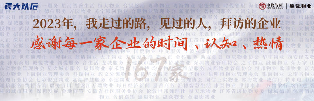我要感谢在过去的2023年我拜访过的167家企业,请教过的每一位朋友。感谢每一家企业的时间、认知和热情。感谢你们对中物智库的支持;你们的思考,你们的实践,给了我们很多启发,也推动着物业行业的创新发展。