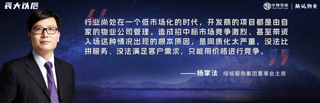 绿城服务董事局主席杨掌法认为:行业尚处在一个低市场化的时代,开发商的项目都是由自家的物业公司管理。造成招中标市场竞争激烈、甚至带资入场,这种情况出现的根本原因,是同质化太严重,没法比拼服务、没法满足客户需求,只能用价格进行竞争。