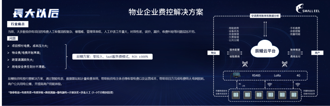在物管行业,尤其是商业楼宇板块,物业费拖欠、垫资问题早已是家常便饭。当下物管第一核心指标为按时缴费率,即物业水、电、气、租金等费用的按时缴纳,其收入成本结构较为单一。例如,辰鳗科技在成都的一个商业综合体客户,该项目每年的缴费率只有 77%,存在 15%的呆帐, 8%的坏帐。因此,改变物业的收费模式,从原先的垫付账单模式,变成预付费模式,通过收费体系完善监管体系,解决物业的现金流和成本的问题。是辰鳗提供的第一个解决方案—— 商业楼宇经营管理解决方案。