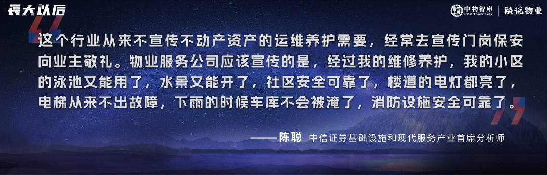 “这个行业从来不宣传不动产资产的运维养护需要,经常去宣传门岗保安向业主敬礼。物业服务公司应该宣传的是,经过我的维修养护,我的小区的泳池又能用了,水景又能开了,社区安全可靠了,楼道的电灯都亮了,电梯从来不出故障,下雨的时候车库不会被淹了,消防设施安全可靠了”。