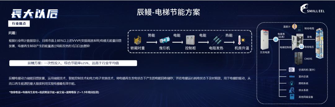 辰鳗科技自去年下半年年底开始落地,商业化电梯动力储能回馈方案,应用在公寓、住宅、写字楼、酒店等十层以上的电梯上。在轻载上行、重载下行、制动减速状态下,电机产生的再生电能通过自动电阻发热消散掉,从节能角度来说,升降电梯在使用 CMERS 后,可以将再生电能回收储存,并在电梯运行耗电状态下及时释放,用于电梯驱动,实现电梯有效节能。例如, 某财富中心某项目上,一部电梯每天能够节省 10-15 度。安装了 CMERS 的柜式电梯年综合节电率可达25%。