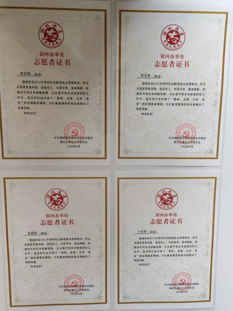 近日,郑州航空港区银河办事处对河南兴业源物业郑州美创科技产业园项目积极参与疫情防控的的优秀志愿者进行了表彰,向他们颁发的荣誉证书和感谢信,感谢他们在疫情防控中的无私奉献。