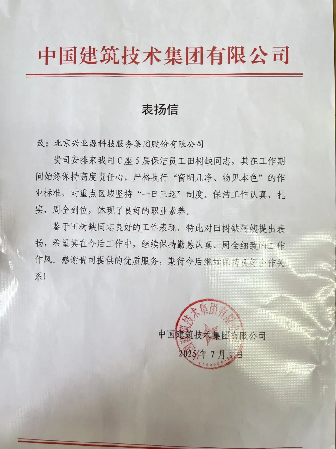 近日,兴业源服务建研院项目收到一封由中国建筑技术集团有限公司发来的热情洋溢的表扬信,对高品质保洁服务表示高度认可和衷心感谢,这封表扬信不仅是对物业保洁人员辛勤付出的肯定,也是公司的服务质量取得实效的有力印证。