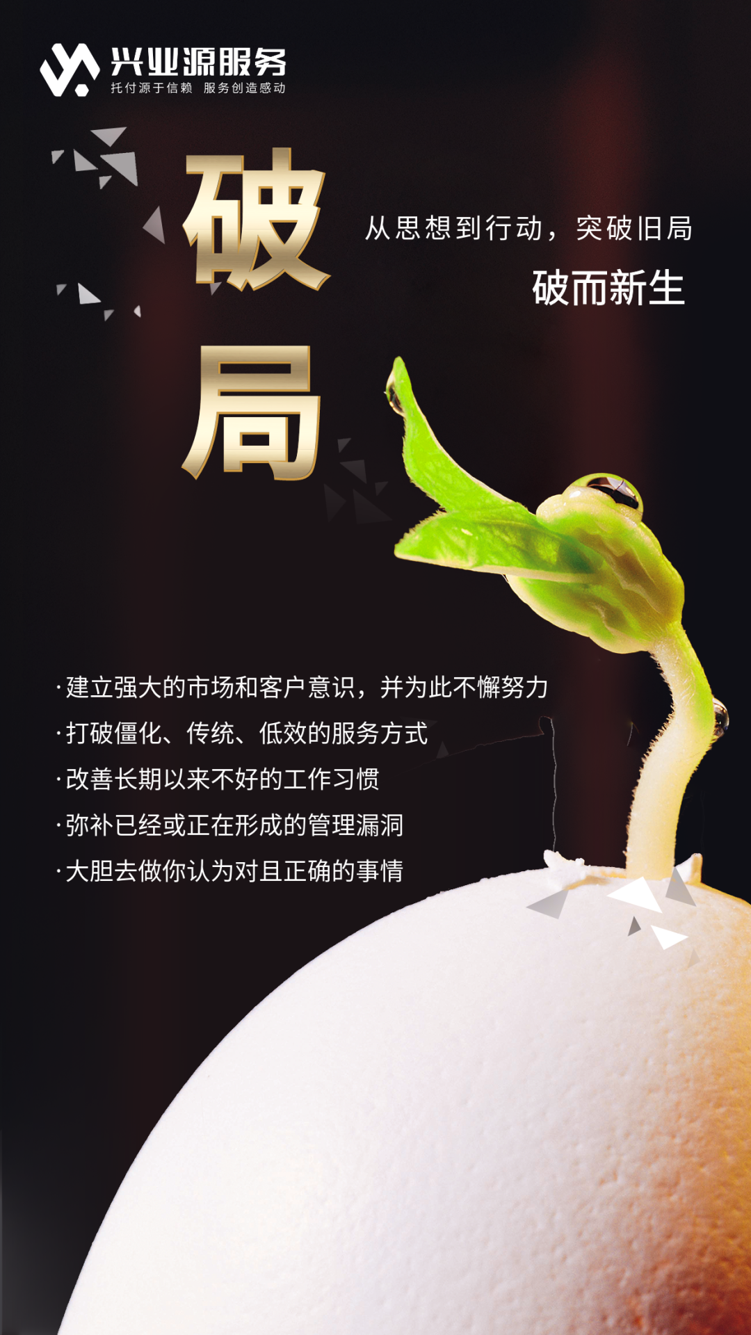 建立强大的市场和客户意识,并为此不懈努力 打破僵化、传统、低效的服务方式 改善长期以来不好的工作习惯
