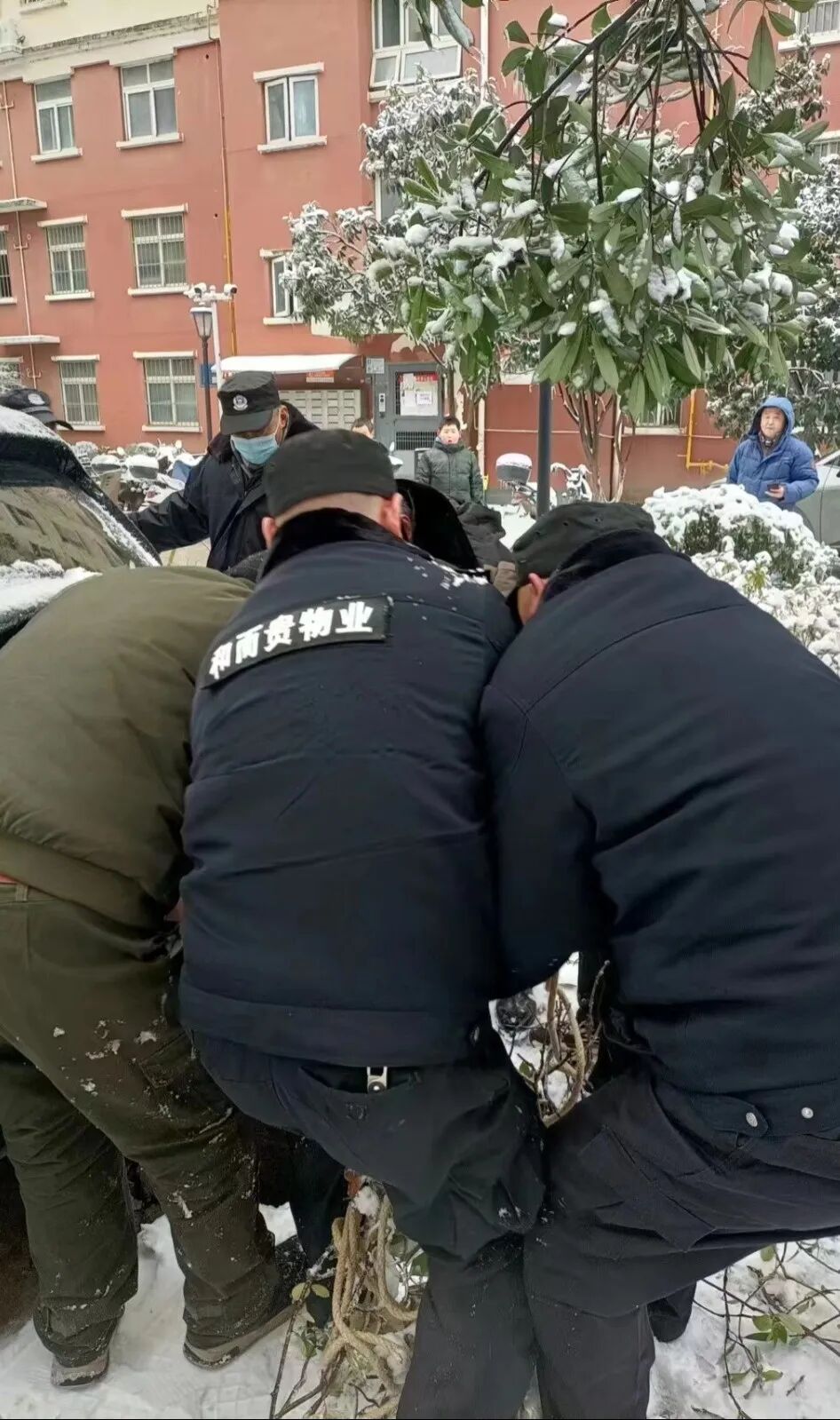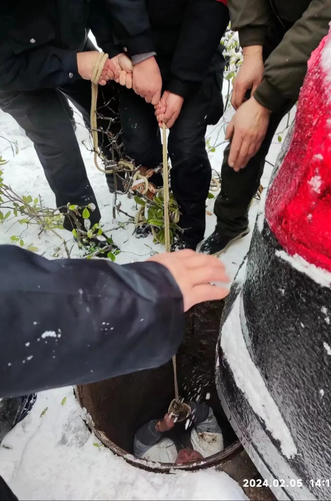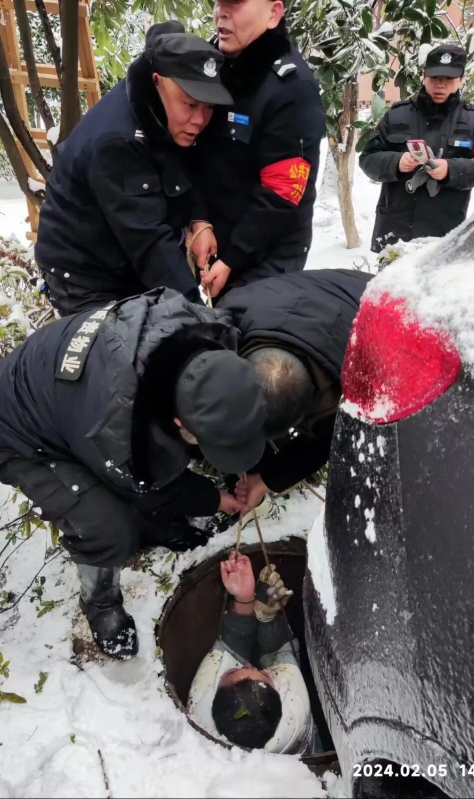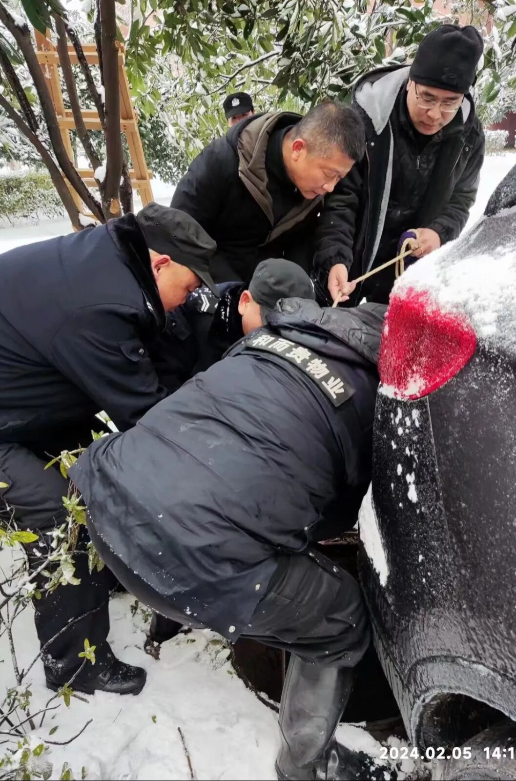 2024年2月5日,武汉迎来了自2008年以来最大的雨雪天气,2月3日白天起,出现罕见的冻雨天气,2月4日至2月5日出现大到暴雪,5日凌晨后,气温最低达零下5度。极端的天气往往伴随着未知的安全隐患,武汉市洪山区和平街东方雅园一期,便发生了一起小区居民不慎跌入窨井的事件。因为罕见的低温冻雨天气使强化塑料材质的窨井盖脆化破裂,且窨井位置处于绿化带内并被雪覆盖难以发现,居民玩雪不慎掉进了窨井。事发后,该小区物业服务企业-兴业源控股公司武汉和而贵物业迅速响应,及时处置,救出被困人员,最终未造成人员伤亡。2024年2月5日,14时10分许,武汉市洪山区和平街东方雅园一期武汉和而贵物业服务中心接到业主告知,在本小区4栋附近窨井内发现一名被困人员,物业服务中心接到消息后迅速做出反应,物业经理齐文涛带领8名物业工作人员组成应急救援小队,携带照明设备、竹梯、安全绳及送风设备于14时13分许,到达困人窨井位置并发现被困人员,救援队伍深知在零下3℃的水中,每耽误一分钟,被困人员的生存空间都在被压缩,在与死神抢时间的紧急情况下,救援队伍首先与被困人员进行交流沟通,确保被困人员意识清醒,在确认被困人员意识清醒的同时,完成窨井的照明、通风以保证被困人员情绪稳定,同步放下安全绳及竹梯,让被困人员迅速脱困。14时19分成功营救出被困人员,因救援及时未造成人员伤亡。 事后,被困业主因物业的及时救援而转危为安,人身安全得以保障,对武汉和而贵物业的救援表示感谢并高度赞扬。