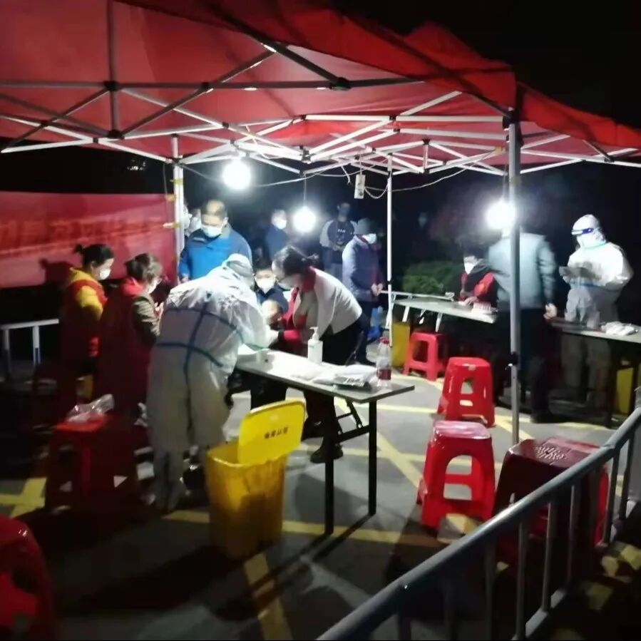 根据社区负责人紧急通知要求,项目部主要成员协助社区,在指定区域迅速搭建帐篷,保安搬来桌椅,工程人员拉起电线架好灯具,客服准备好消杀物品。当夜晚来临时刻,通过物业工作人员高音喇叭的广播,前来进行核酸检测的小区业主排起两条“长龙”,项目主任及主管又主动担负起维护秩序的“安保员”,确保检测队伍有序有章进行,检测工作一直持续到深夜,像这样的核酸检测已持续检测至六轮。