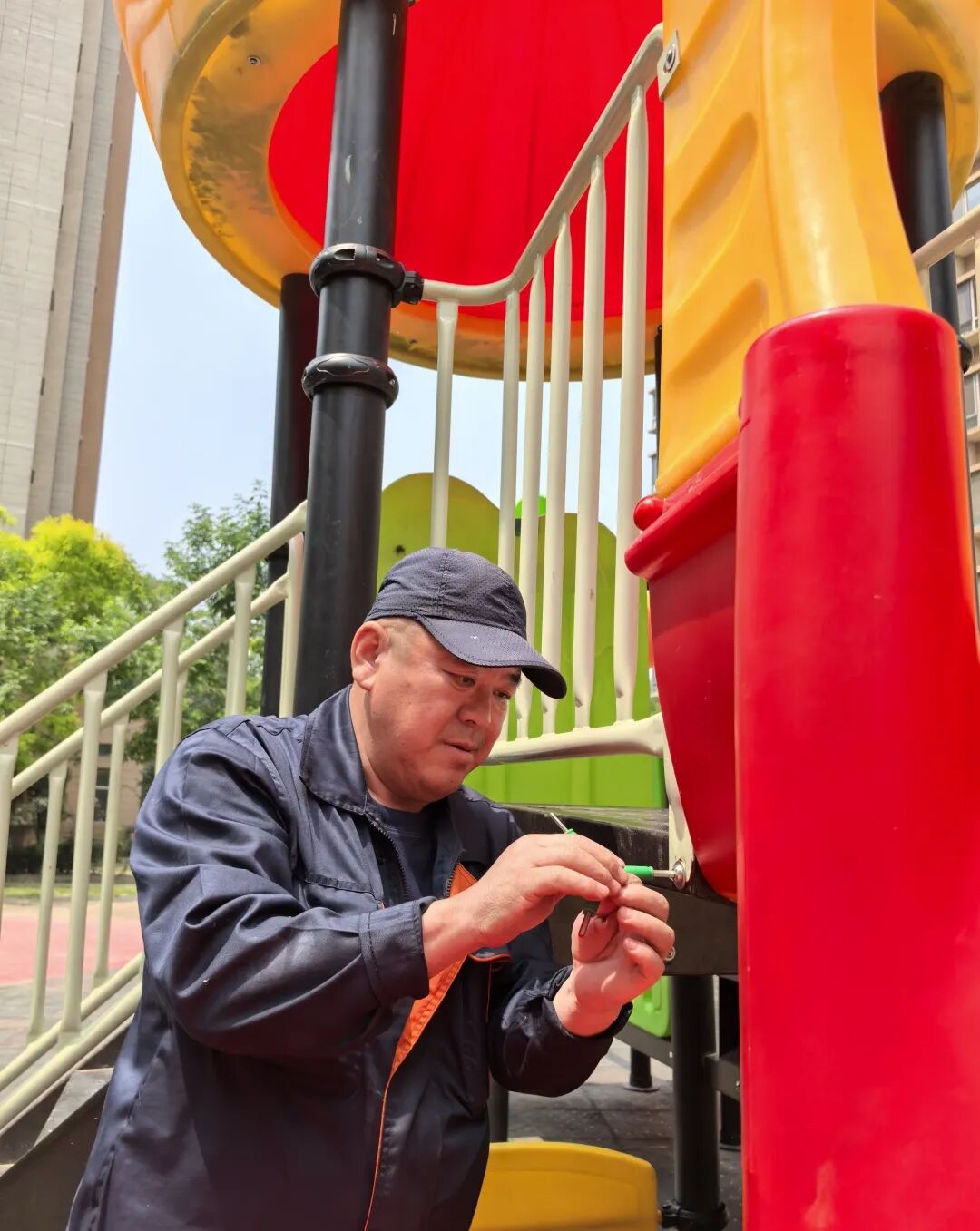 在2025年4月10日天津市气象台发布大风预警后,陈师傅主动担任起排险任务,他迅速带上所需工具,雨衣、扳手、绳索、应急照明等设备;然后马不停蹄地投入到小区排险抢修工作当中。狂风中您能看见陈师傅穿梭在小区各个角落的身影,对园区安全隐患和小区公共设施进行排查。陈师傅发现几处楼栋外的空调外机防护栏因螺丝松动被风吹得摇摇欲坠,随时有掉落风险。他赶忙架好梯子,手脚麻利地拧紧螺丝,并加固了防护栏的连接处。