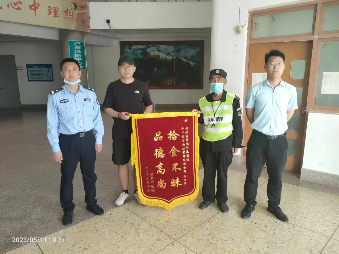 5月11日,侯女士来滨医附院复查时委托其亲属再次来到物业停车管理部值班室,为刘宝泽师傅赠送锦旗一面,“拾金不昧,品德高尚”以表侯女士衷心的感谢及崇高的敬意。