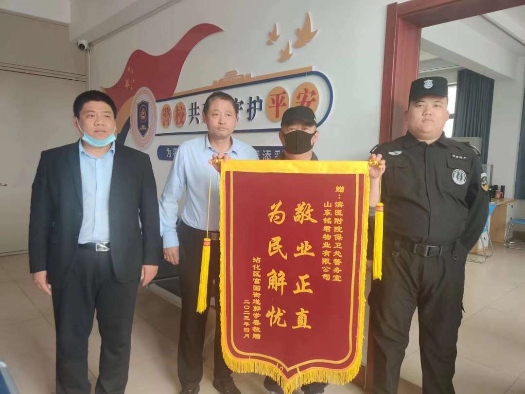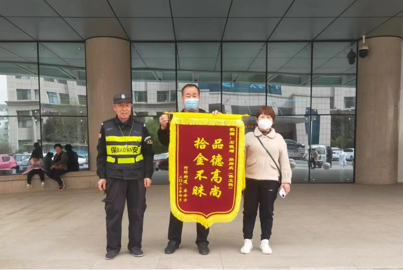 最终在多方努力地排查下,锁定拾取失主背包的人,并在护士站的协助下找到此人信息,经协调后将背包归还给失主,失主看到失而复得的背包非常激动,而后为保卫科警务室送来一面印有“敬业正直,为民解忧”的锦旗表示感谢!