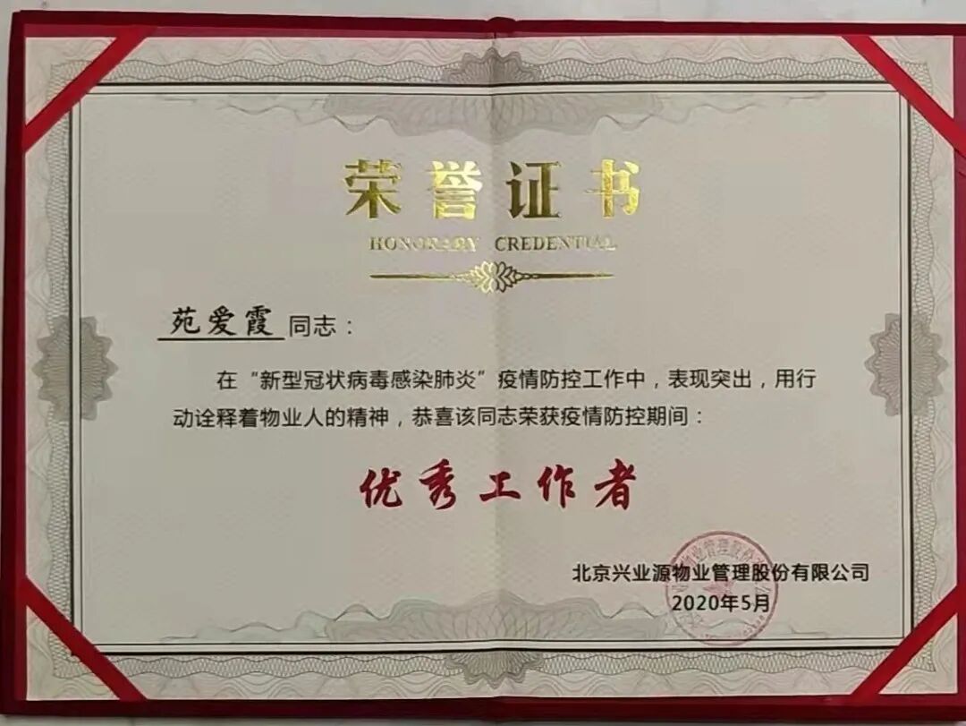 疫情防控期间,更是贴心帮助业主,每日早出晚归,舍小家为大家,为响应街道办事处关于限制人员流动,防范交叉感染的号召,苑爱霞勇敢的冲在抗疫筛查第一线,每天必做的事情就是拿着喇叭进行园区巡逻并传达疫情防范知识和上级领导交代的各项要求,她总是想为客户“+”一点,再“+”一点,在满分的基础上,再加一分的热情、贴心、和理解,她力求实现自我,超越自我,秉承着“我们多努力,让您更满意的”的服务理念,夯实基础,扎实工作,为业主呈现更专业、更优质的服务,苑爱霞用她的实际行动践行着当初她曾许下的诺言:“工作只有不想干,没有干不好,做好物业服务工作,就是我的初心。”