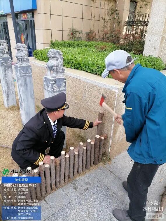 在日常项目巡视中发现在通往各楼栋路口的草坪均被非机动车不同程度的碾压,造成草坪转角斑秃现象,安装围栏费用较高,使用本该拆除的支撑架制作成围栏,既解决保护草坪的问题,又有效减少了开支,美化了环境。