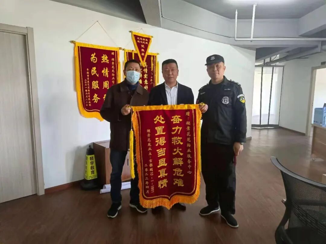 4月2日18:30左右,湖景花苑一业主家突发大火,值班保安班长吴海良收到其他业主报告后迅速拨打119后即刻赶往失火楼栋,立马部署人员疏散楼道居民,并安排人员到路口迎接消防车。