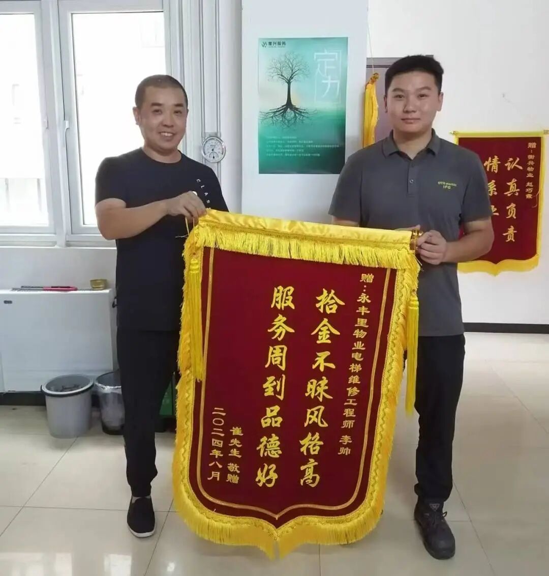 9 月 4 日,永丰里业主崔先生乘坐电梯时不小心将钱包掉进电梯缝隙,焦急之下赶忙给永丰里物业打电话。物业人员第一时间联系电梯工,虽因电梯结构问题拾取物品稍有困难,但在各部门齐心协力下,最终成功将钱包取出。业主崔先生十分高兴,特赠送锦旗表达感激之情。面对失主的千言万语,物业人员一致表示这只是一件寻常小事,他们不仅用劳动创造了和谐的生活环境,更以优良的精神风貌为小区增添光彩。