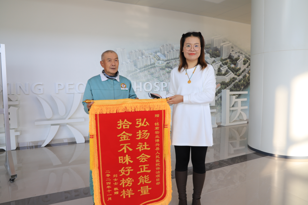 11月6日,患者家属特地来到医院,送上一面写有“拾金不昧好榜样 弘扬社会正能量”的锦旗赠予许江祥,再次诚挚地表达了他们的感激之情。这面锦旗不仅是对许江祥个人品德的肯定,更是对铭君物业人品质的高度赞扬,彰显出物业团队良好的道德风尚。