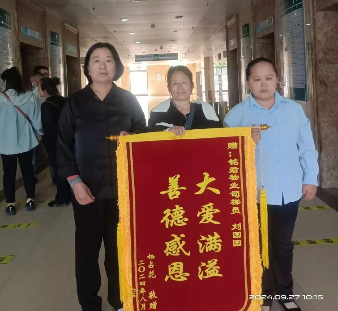 9月27日,杨占花出院后又特意回到医院住院一部,双手送上锦旗,对司梯工作及服务表示极其满意。司梯员刘园园用她的热心、爱心和责任心,再次帮助了一个家庭,也让患者、家属以及医院对铭君物业人的品质更加信赖。