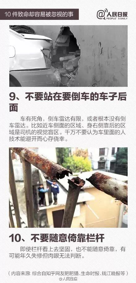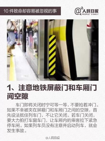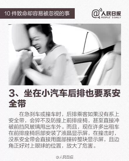 地铁车厢门即将关闭抢着冲进去、站在正在倒车的车子后面、输液时随意调节速度、坐在小汽车后排就不系安全带、自动扶梯十分拥挤却懒得走楼梯步行……10件生活中经常被忽略的事,却暗藏致命的危险!戳图了解↓↓关乎生命安全,切不可大意。