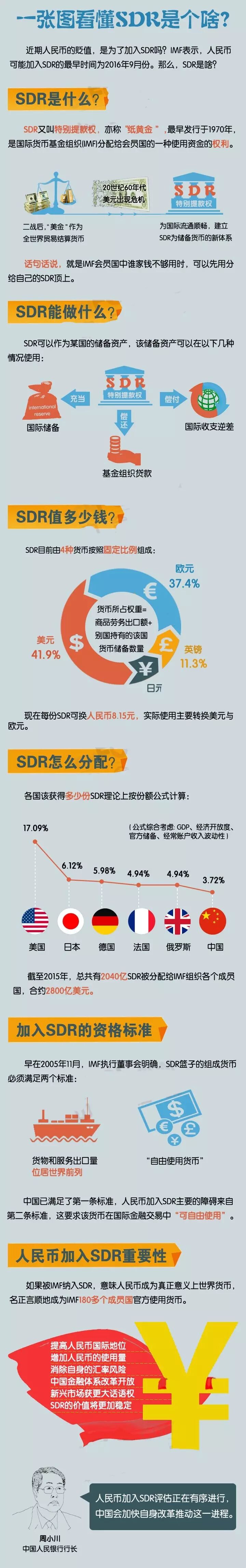 SDR即特别提款权,是IMF成员国对可自由使用货币配额的潜在债权。其实它是一种补充性的国际储备资产,是IMF和其它一些国际组织的记账单位,也被称为“纸黄金”。