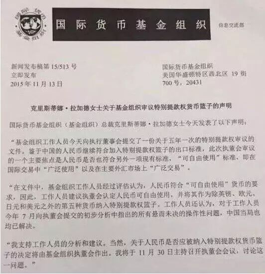 北京时间11月14日清晨,根据国际货币基金组织(IMF)突然发布IMF总裁拉加德关于特别提款权货币篮子(SDR)的声明!我们来看看拉加德是怎么说的。