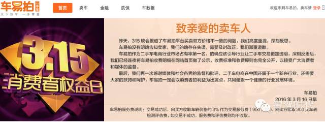 车易拍在央视315晚会后在首页做出致歉的同时,在首页做了说明——车易拍服务费说明:交易成功后,向买方收取车辆价格的3%作为交易服务费(900元),向卖方收取300元车辆检测评估费,如交易不成功,服务费和评估费则均不收取。