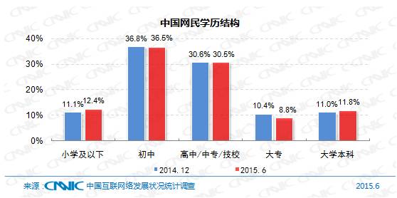 整体网民中小学及以下学历人群的占比为12.4%,较2014年底上升1.3个百分点。与此同时,大专及以上人群占比下降0.8个百分点,中国网民继续向低学历人群扩散。