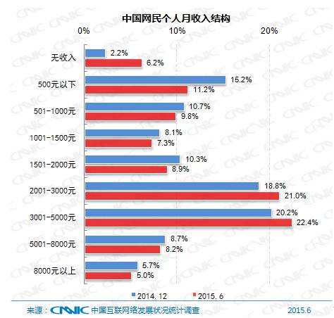 网民中月收入在2001-3000元、3001-5000元的群体占比最高,分别为21.0%和22.4%。