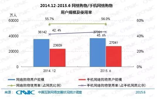 与整体市场不同,我国手机网络购物用户规模增长迅速,达到2.70亿,半年度增长率为14.5%,手机购物市场用户规模增速是整体网络购物市场的4.1倍,手机网络购物的使用比例由42.4%提升至45.6%。