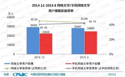 截至2015年6月,网络文学用户规模较去年底略有减少,达到2.85亿,较去年底减少了918万人,其中手机网络文学用户规模为2.49亿,较去年底增加了2282万人,占手机网民的42%。
