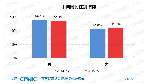 截至2015年6月,中国网民男女比例为55.1:44.9,女性网民占比相比2014年底提升了1.3个百分点。