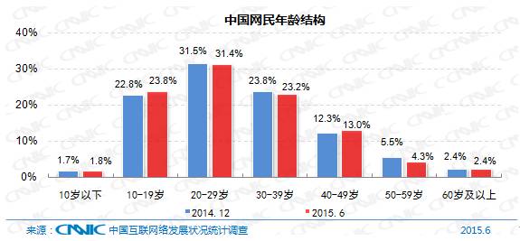 我国网民以10-39岁年龄段为主要群体,比例达到78.4%。其中,20-29岁年龄段网民的比例为31.4%,在整体网民中的占比最大。与2014年底相比,20岁以下网民规模占比增长1.1个百分点,互联网继续向低龄群体渗透。