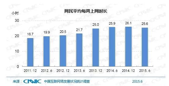 2015年上半年,中国网民的人均周上网时长达25.6小时,相比2014年底减少0.5个小时。