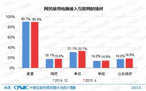 我国网民在家里、网吧、学校和公共场所通过电脑接入互联网的比例与2014年12月基本持平,而在工作单位通过电脑接入互联网的比例则有所上升,为33.7%。