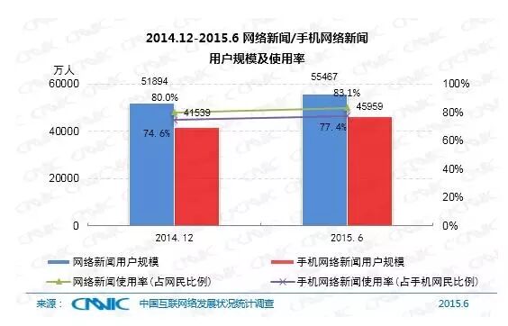 截至2015年6月,我国网络新闻用户规模为5.55亿,较2014年底增加3572万,增长率为6.9%。网民中的使用率为83.1%,比2014年底增长了3.1个百分点。