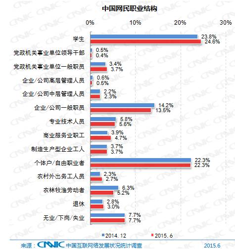 网民中学生群体的占比最高,为24.6%,其次为个体户/自由职业者,比例为22.3%,企业/公司的管理人员和一般职员占比合计达到16.3% 。