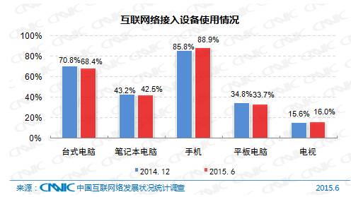 截至2015年6月,中国网民通过台式电脑和笔记本电脑接入互联网的比例分别为68.4%和42.5%;手机上网使用率为88.9%,较2014年底提高3.1个百分点;平板电脑上网的比例为33.7%,较2014年底下降了1.1个百分点;网络电视使用率为16.0%。