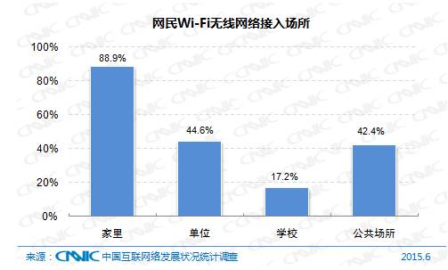 除3G/4G外,Wi-Fi无线网络也成为主要的上网方式,截止到2015年6月,83.2%的网民在最近半年曾通过Wi-Fi接入过互联网,其中在家里接入Wi-Fi无线网络的比例最高,为88.9%,在单位和公共场所Wi-Fi无线上网的比例相近,分别为44.6%和42.4%。