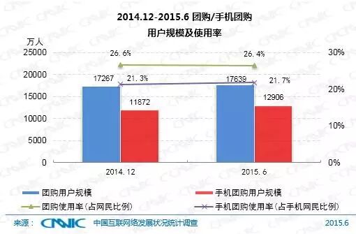 截至2015年6月,我国团购用户规模达到1.76亿,较2014年底增加372万人,半年度增长率2.2%,团购网站的使用率为26.4%。相比整体团购市场,手机团购发展更为迅速,手机团购用户规模达到1.29亿,半年度增长率为8.7%,手机团购的使用比例为21.7%。