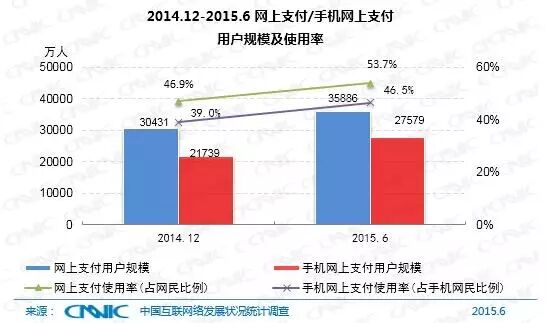 截至2015年6月,我国使用网上支付的用户规模达到3.59亿,较2014年底增加5455万人,半年度增长率17.9%。与2014年12月相比,我国网民使用网上支付的比例从46.9%提升至53.7%。