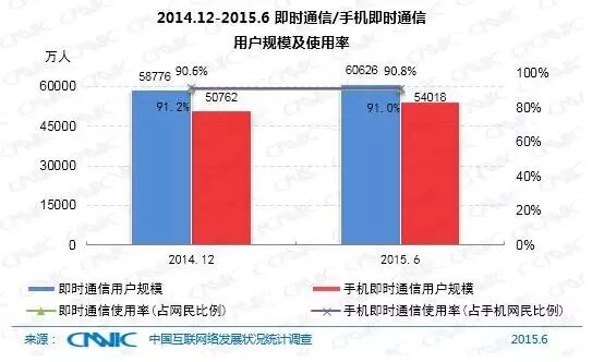 截至2015年6月,网民中即时通信用户的规模达到6.06亿,较去年底增长了1850万人,占网民总体的90.8%,其中手机即时通信用户5.40亿,较去年底增长了3256万人,占手机网民的91%。