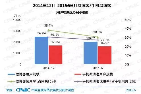 截至2015年6月,我国微博客用户规模为2.04亿,网民使用率为30.6%,手机端微博客用户数为1.62亿,使用率为27.3%。自2013年开始,搜狐、网易、腾讯等公司对微博客投入力度陆续减少,微博客市场内部的品牌竞争格局已经明朗,用户逐渐向新浪迁移和集中。