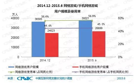截至2015年6月,网民中网络游戏用户规模达到3.80亿,占整体网民的56.9%,其中手机网络游戏用户规模为2.67亿,较去年底增长了1876万人,占手机网民的45%。网络游戏在2015年上半年整体依旧保持快速发展并逐渐呈现多样化趋势,而不同的游戏类型其多样化趋势亦不完全相同。