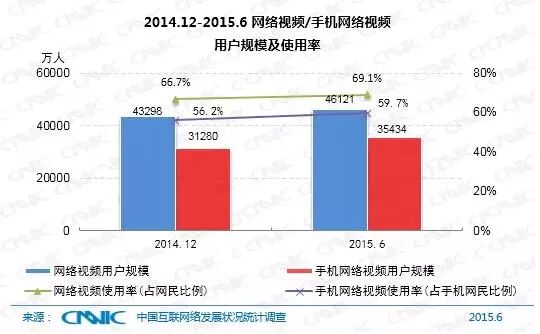 截至2015年6月,中国网络视频用户规模达4.61亿,较去年年底增加2823万人,网络视频用户使用率为69.1%,比去年年底上升了2.3个百分点。
